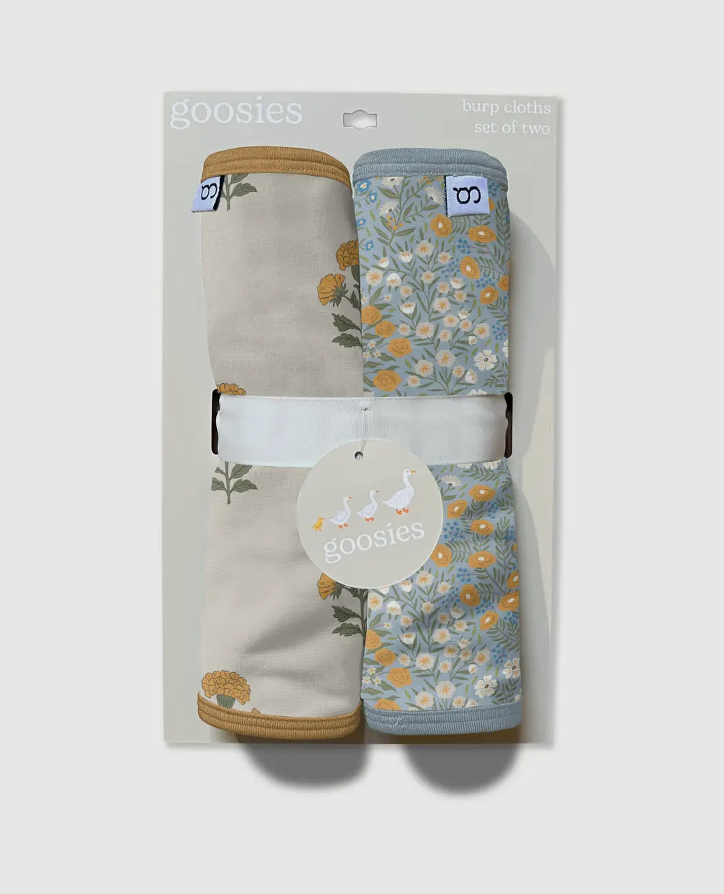 Set of Two Burp Cloths Front: 95% Bamboo, 5% Spandex Back: Back: 65% Polyester, 35% Cotton Terrycloth Machine wash cold on gentle cycle. Flat dry or tumble low. Packaged on a hangable branded card.