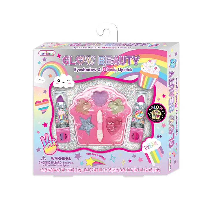 This glow set will not only beautify the cool girls but will also light up any room with the glow in the dark eyeshadow case. Contains: 1 Glow in the dark eyeshadow palette 2 Moody lipsticks 1 Eyeshadow Applicator