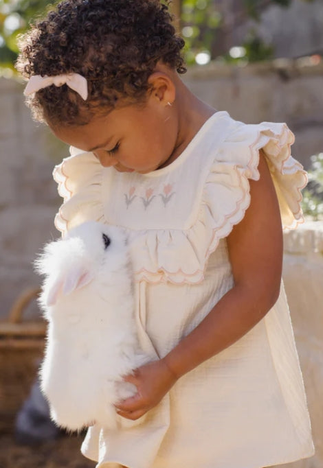Our Lulu Dress is perfect for your springtime occasions. Featuring a gathered ruffle with merrowed edge detail along the chest with tulip embroidery and buttons on back for easy changes.